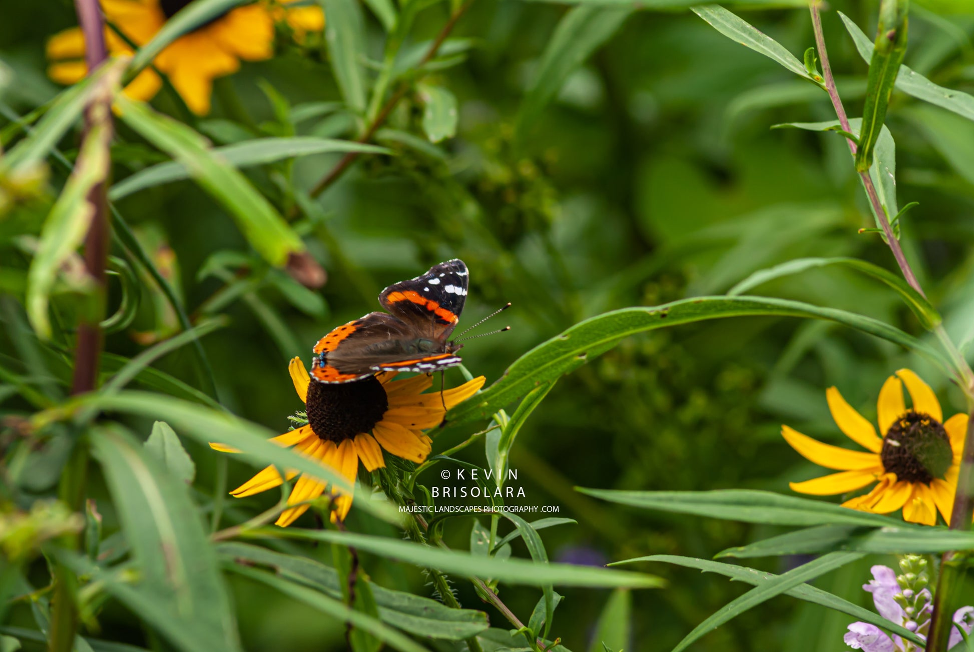 A beautifully marked red admiral butterfly stands atop a black-eyed susan flower not far off the trail at Wildflower Park in Northern Illinois. (429-84)