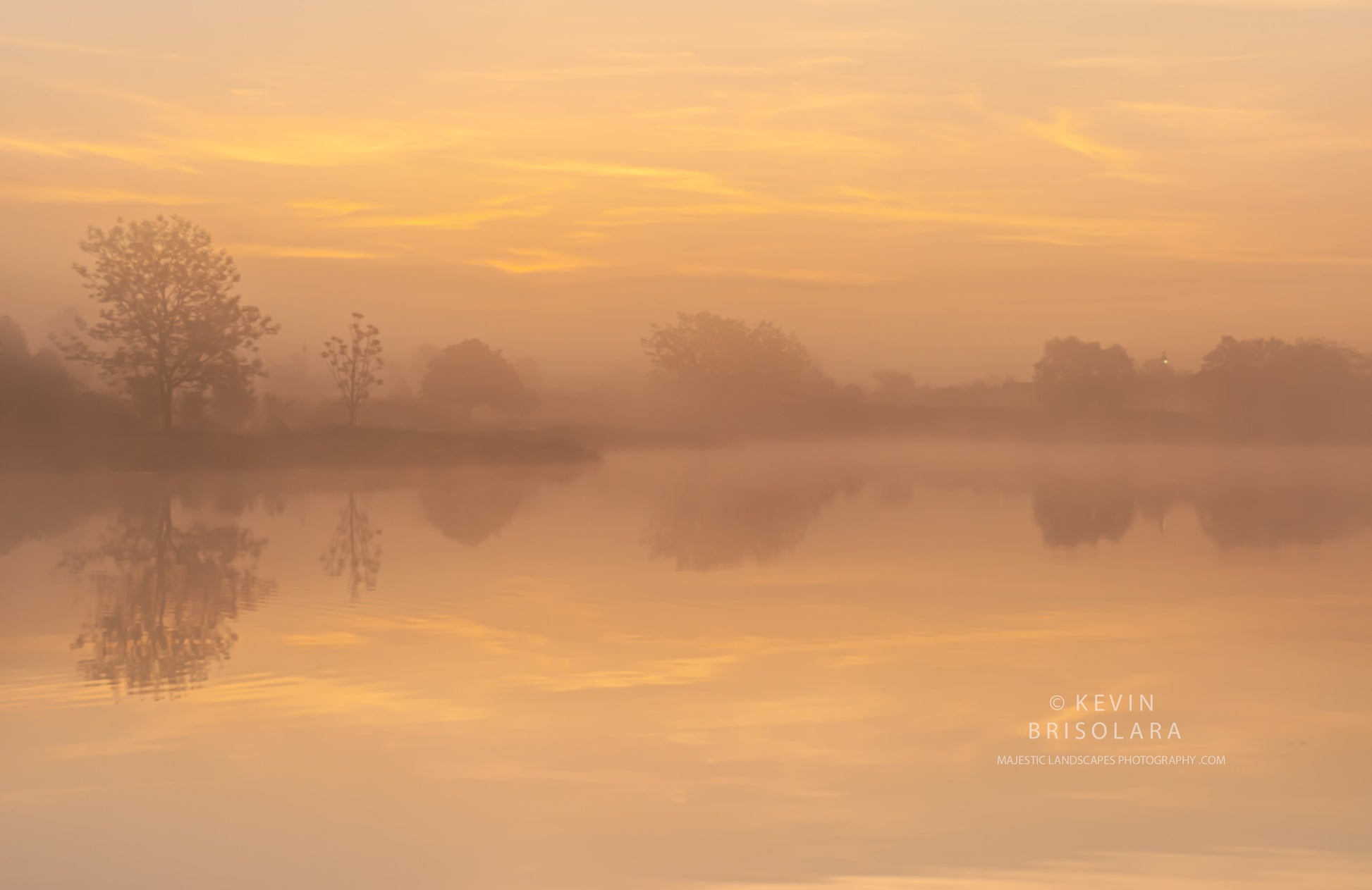 A colorful misty sunrise is reflected onto a calm and peaceful Wildflower Lake on this spring morning at Wildflower Park. (490-17)