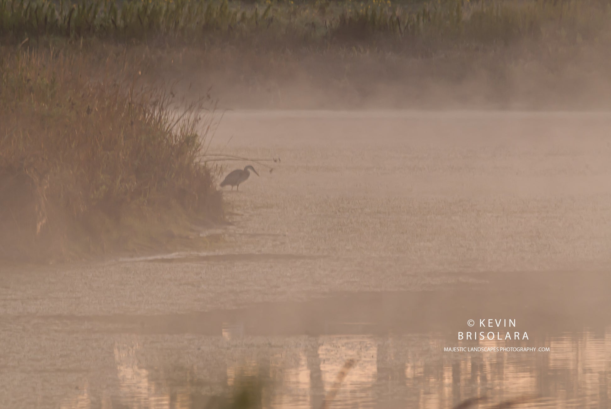 A great blue heron remains motionless as mist comes off of wildflower lake on this august morning in Northern Illinois. (463-75)
