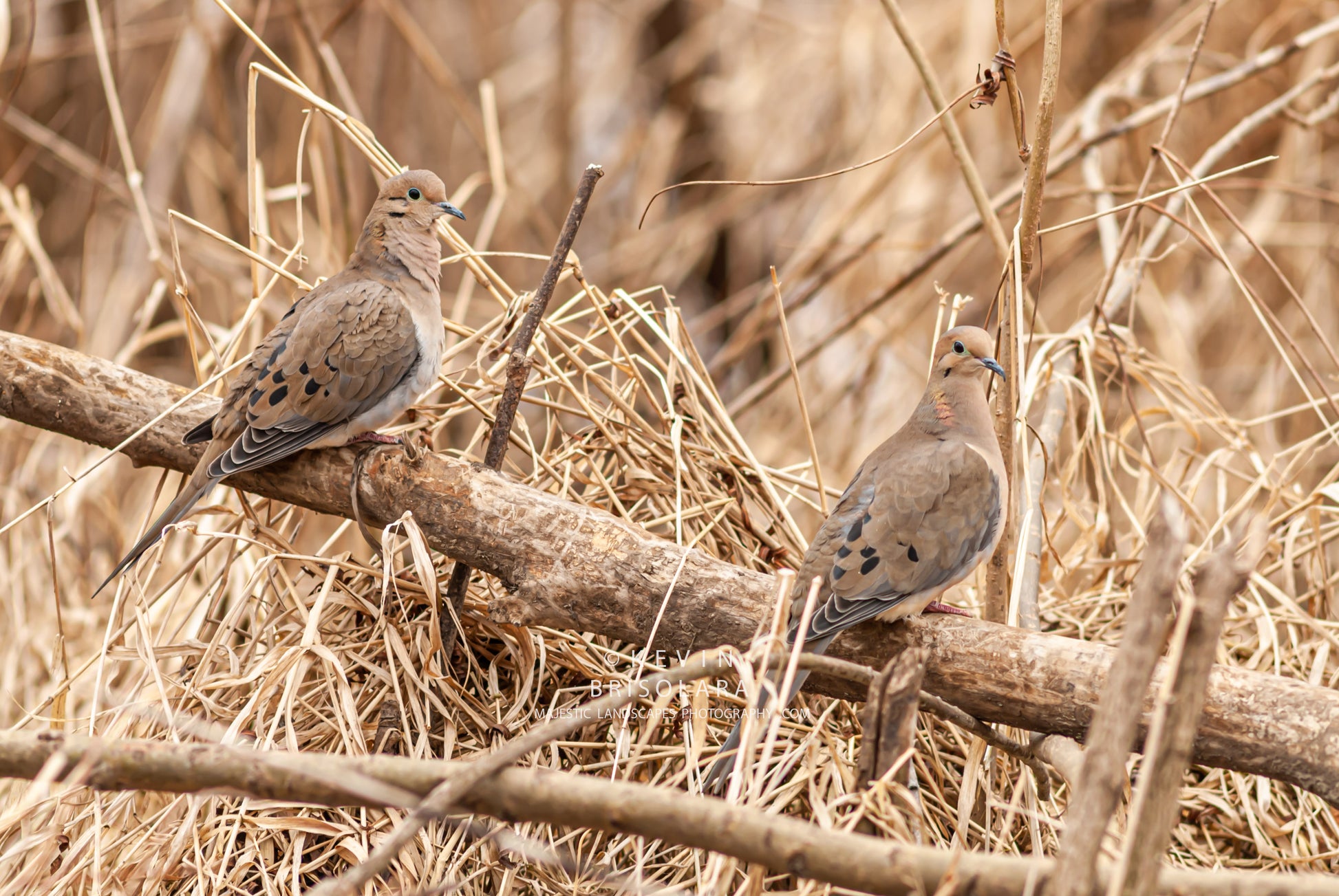 A pair of beautiful mourning doves rest for a moment on a downed tree along the south fork kishwaukee river in Northern Illinois. (404-47)