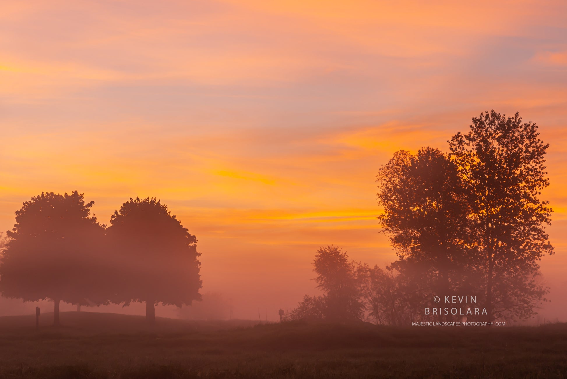 A colorful misty sunrise appears on this May morning with maple, cottonwood and peachleaf willow trees silhouetted against the colorful sky at Wildflower Park. (490-06)
