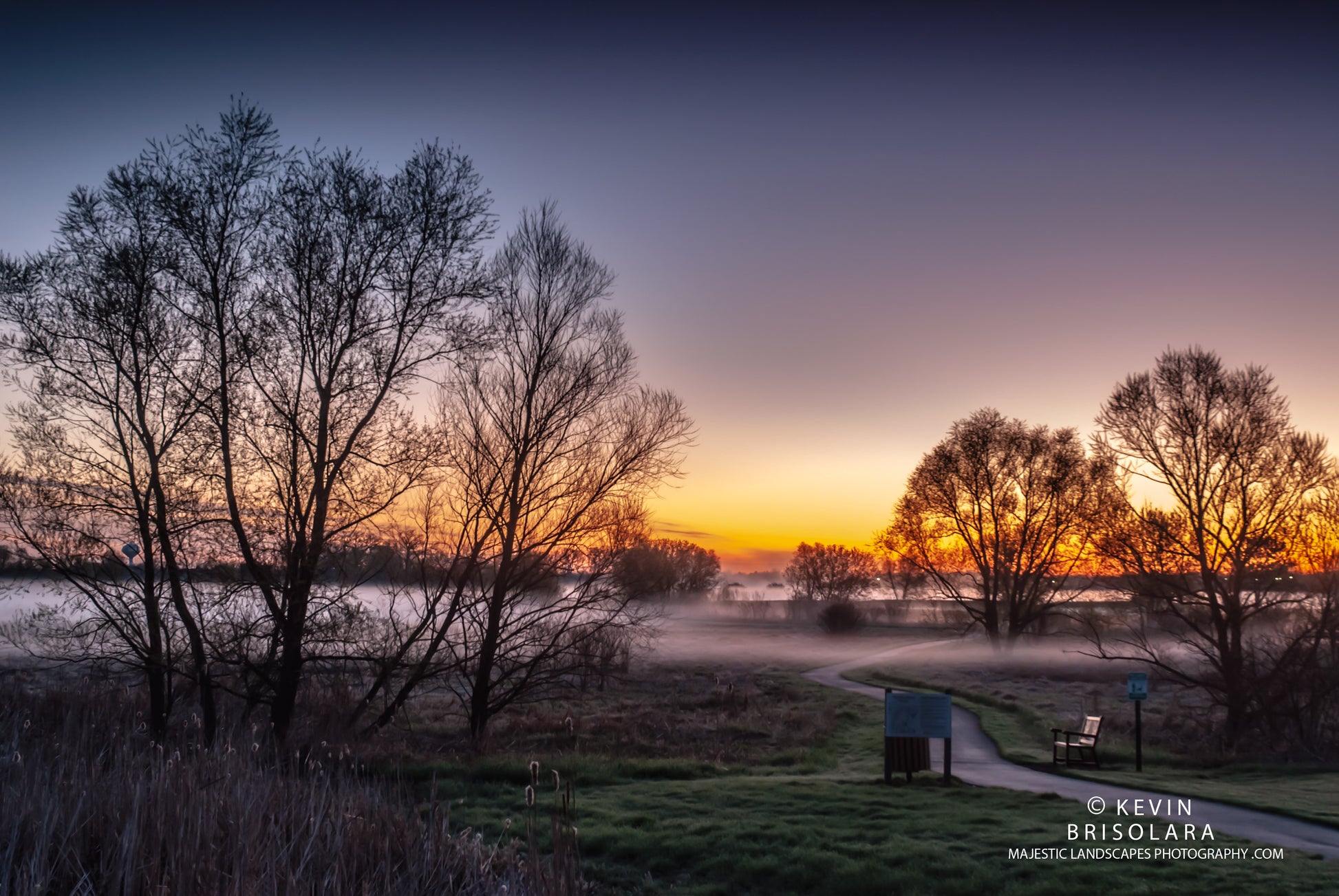 The first things I see while starting out on my walk are the peachleaf willow trees that greet me while a mist hovers over a cool landscape with a beautiful and colorful spring sunrise off in the distance at Wildflower Park. (567-01)