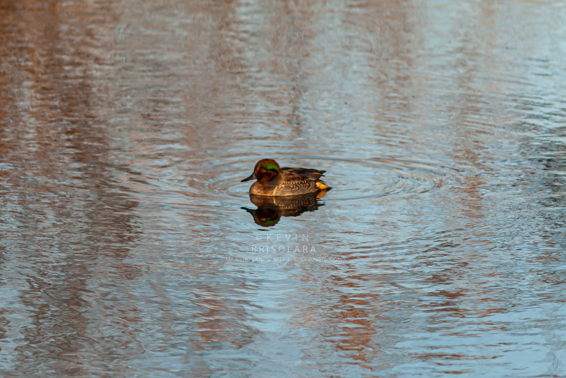 A lone male green-winged teal takes a few moments to rest on the south fork kishwaukee river from migrating north in Northern Illinois. (391-124)